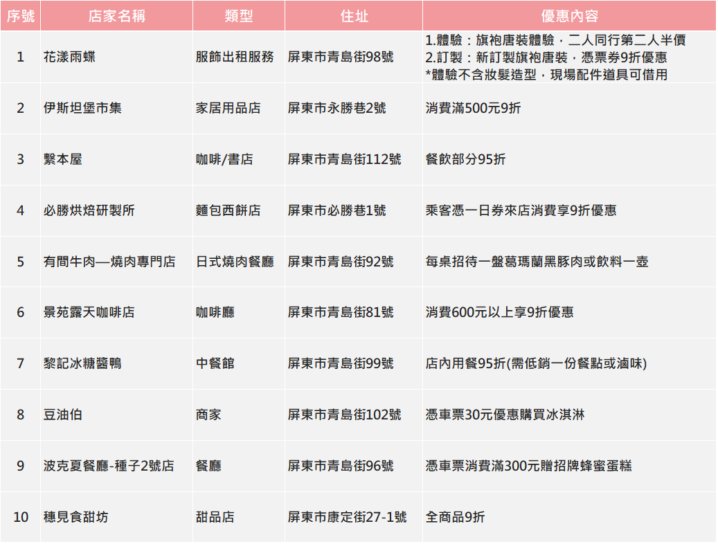 一日券優(yōu)惠合作商家(若有異動,依實際商家優(yōu)惠為主)